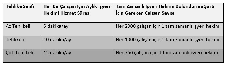 Not: Az tehlikeli sınıfta her 2.000 kişi için, tehlikeli sınıfta her 1.000 kişi için, çok tehlikeli sınıfta her 750 kişi için tam zamanlı, en az 1(bir) işyeri hekimi bulundurulması zorunludur. Belirlenen sınıflardaki sayıların tam katlardan fazla olması halinde belirlenmiş kişi başı süre hesaplama metoduyla, belirtilen ölçütlere uygun olacak şekilde yeteri kadar iş güvenliği uzmanı ek olarak görevlendirilir.